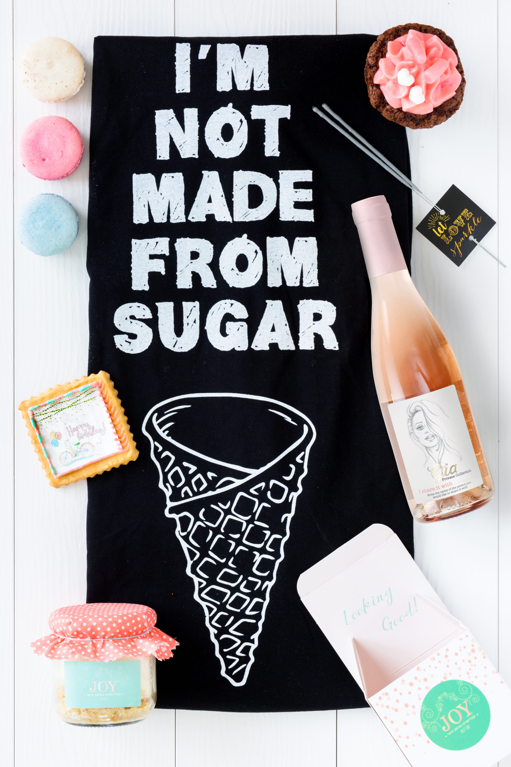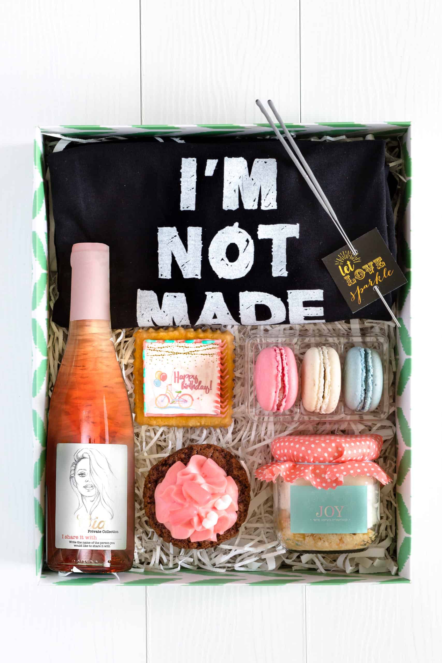 שילוב מנצח של חולצה הורסת, בקבוק יין , מקרונים, וזיקוקים ממותגים להשלמת היום המיוחד הזה! ליום נוצץ, שיגרום לכל אחת לא להפסיק לחייך במשך שבוע שלם!