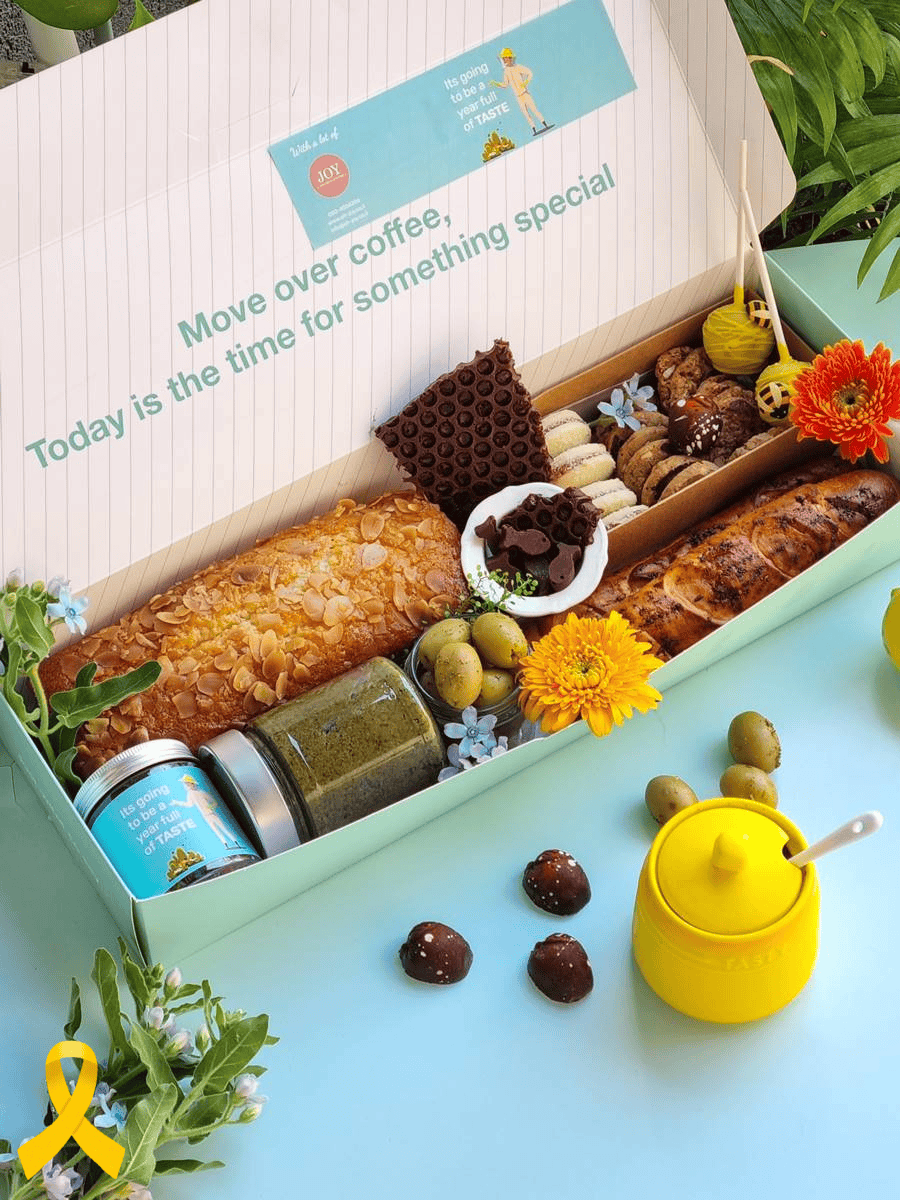 מארז מתוק ומלא שמחה, מיוחד לנשנוש קבוצתי למשפחה או שותפים עסקיים. מלוח ומתוק גם יחד כך שכל אחד יהנה מחגיגת טעמים. מואר בצבעי צהוב ותכלת רכים ומרגיעים. הוא נוצר כדי להביא חום, אופטימיות ותמיכה לכל אחד שתרצו לאחל שנה של התחלה מרגיעה שתאיר מעט את החג ברגעים טעוני רגש. כל פריט במארז נבחר בקפידה כדי לשדר רוגע, תקווה ונחת עם אחיזה מתוקה למציאות