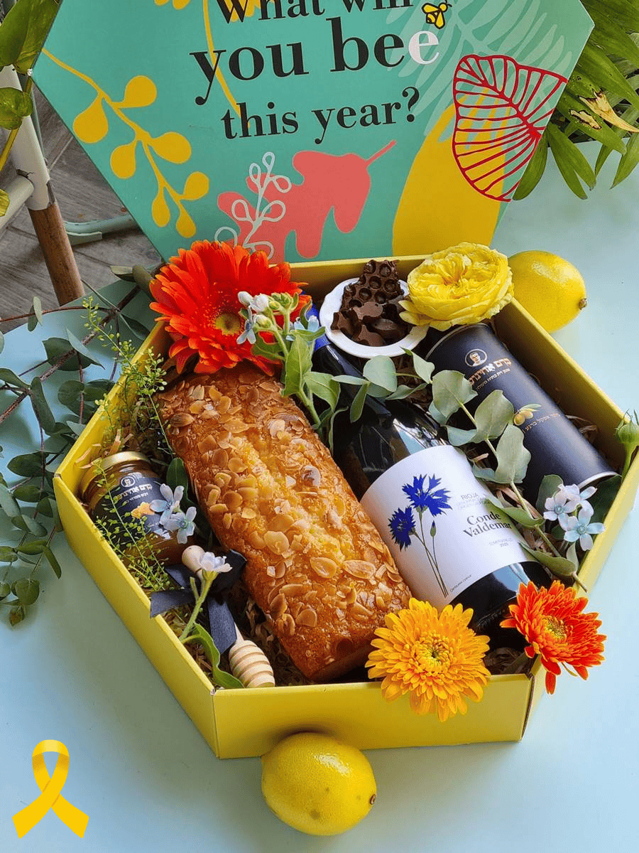 מארז חגיגי ומיוחד, המעוטר בפרחים צהובים כסמל לאור ולתקווה. הוא מתוק ושמח, ומבקש להאיר את הלבבות דווקא ברגעים מורכבים. נגיעה עדינה של הצבע הצהוב מהווה קריצה של הזדהות ותמיכה, ומזכירה את הכוח של אחדות וחיבוק משותף בחג הזה ויחד עם זאת גם להכניס מתוק איכותי שנזכור שהשנה הזו תהיה גם טובה מקודמתה