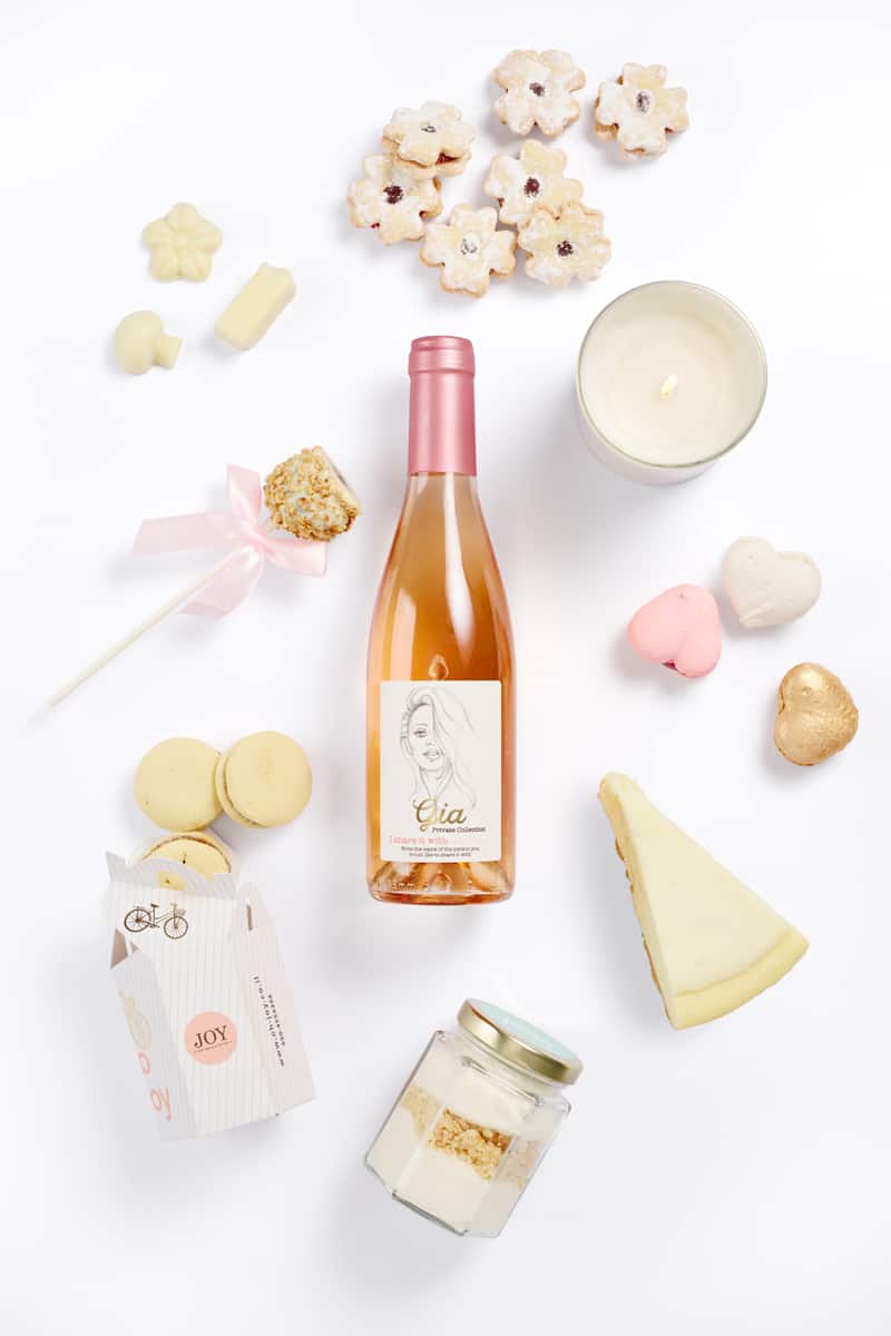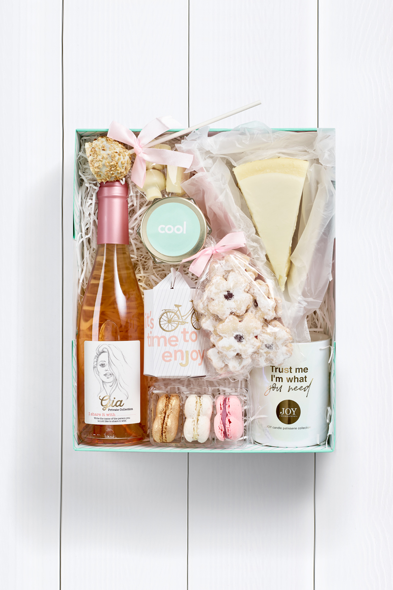עם נר בארומת וניל,  פרלינים משוקולד לבן, שתי עוגות גבינה מסוגים שונים, יין רוזה שמושלם עם גבינות ומתוקים נוספים מאותה הסדרה.